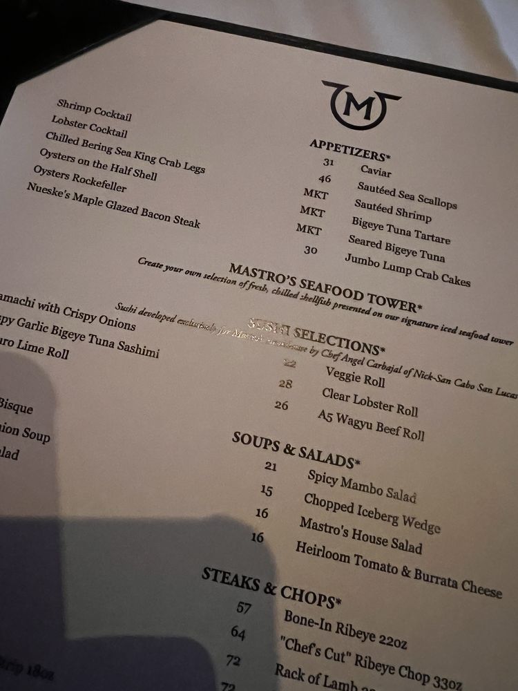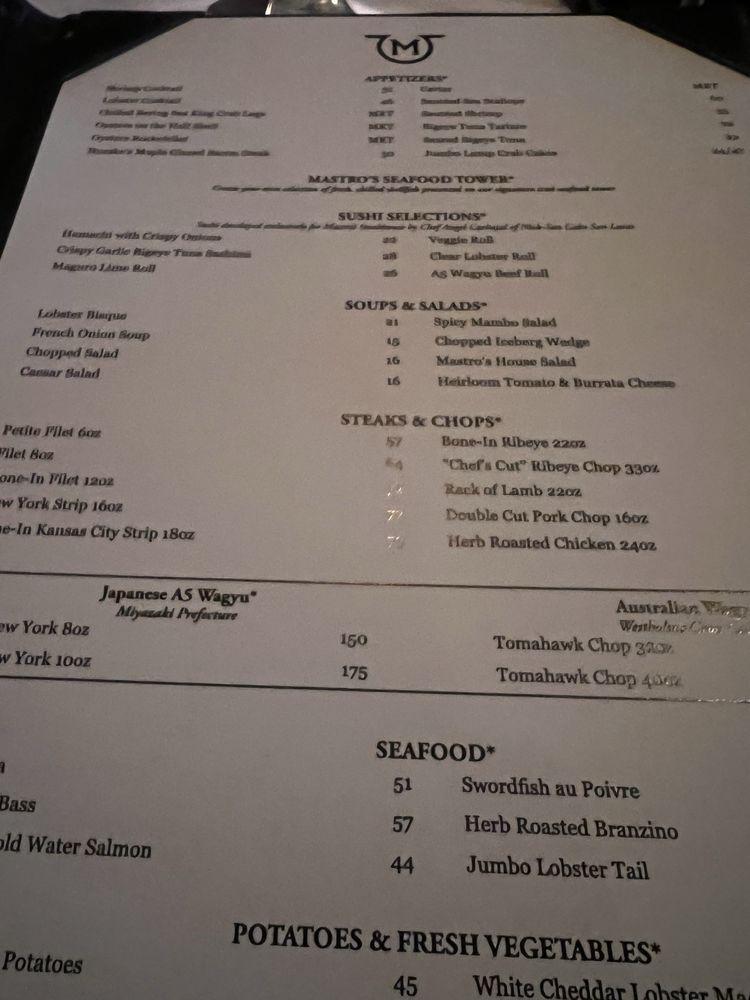Welcome to Mastro's Steakhouse Palm Desert, a pinnacle of luxury dining located at 73405 El Paseo STE 120. Here, you’ll experience a remarkable blend of culinary excellence and elegant ambiance tailored for discerning diners. The menu features an array of enticing options, including fresh seafood and perfectly aged steaks. Start with the decadent Shrimp Cocktail, where U7 black tiger shrimp are beautifully presented, or savor the rich flavors of the French Onion Soup.