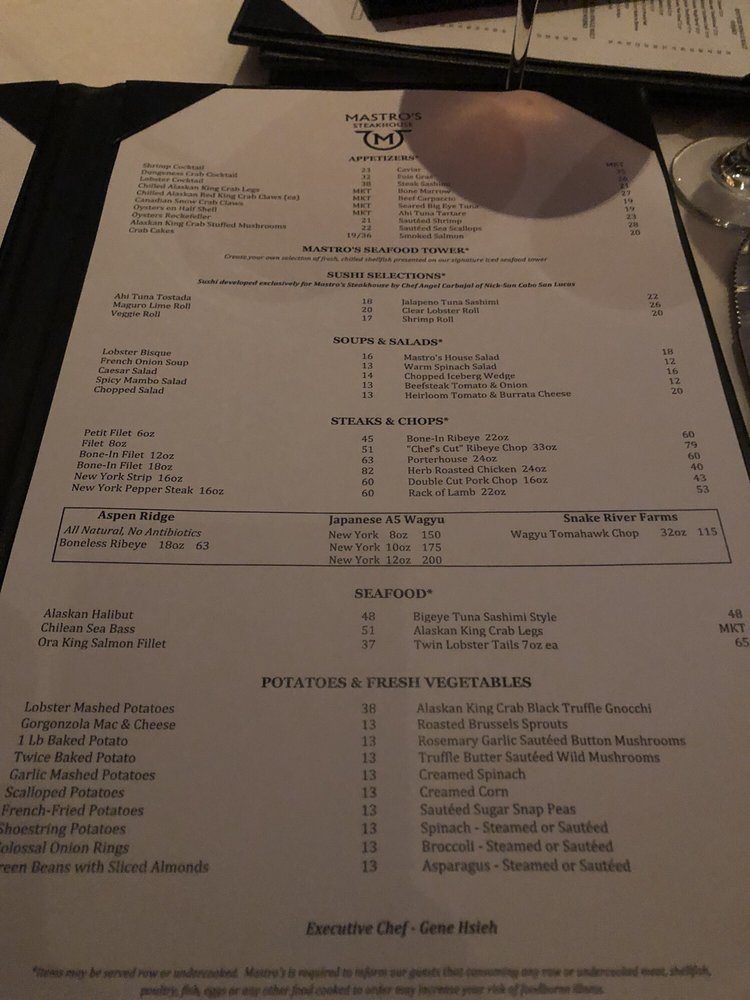 For mains, indulge in the Bone-In Filet, celebrated for its savory tenderness, while Black Truffle Butter and Bone Marrow Butter elevate your steak experience. Don’t overlook the famed Warm Butter Cake—a true culinary delight. With attentive service and live music enhancing the dining experience, Mastro's promises an unforgettable evening for any occasion.